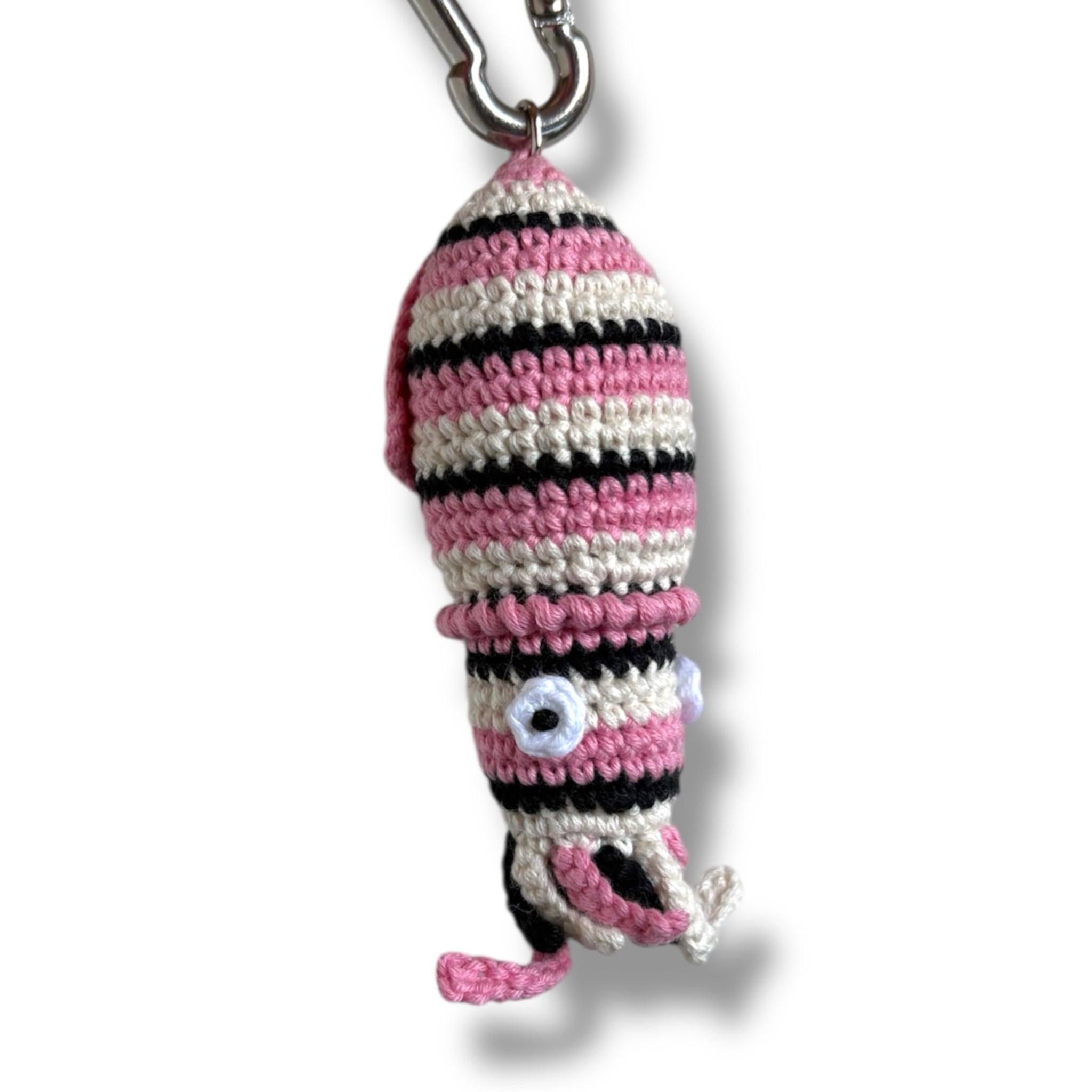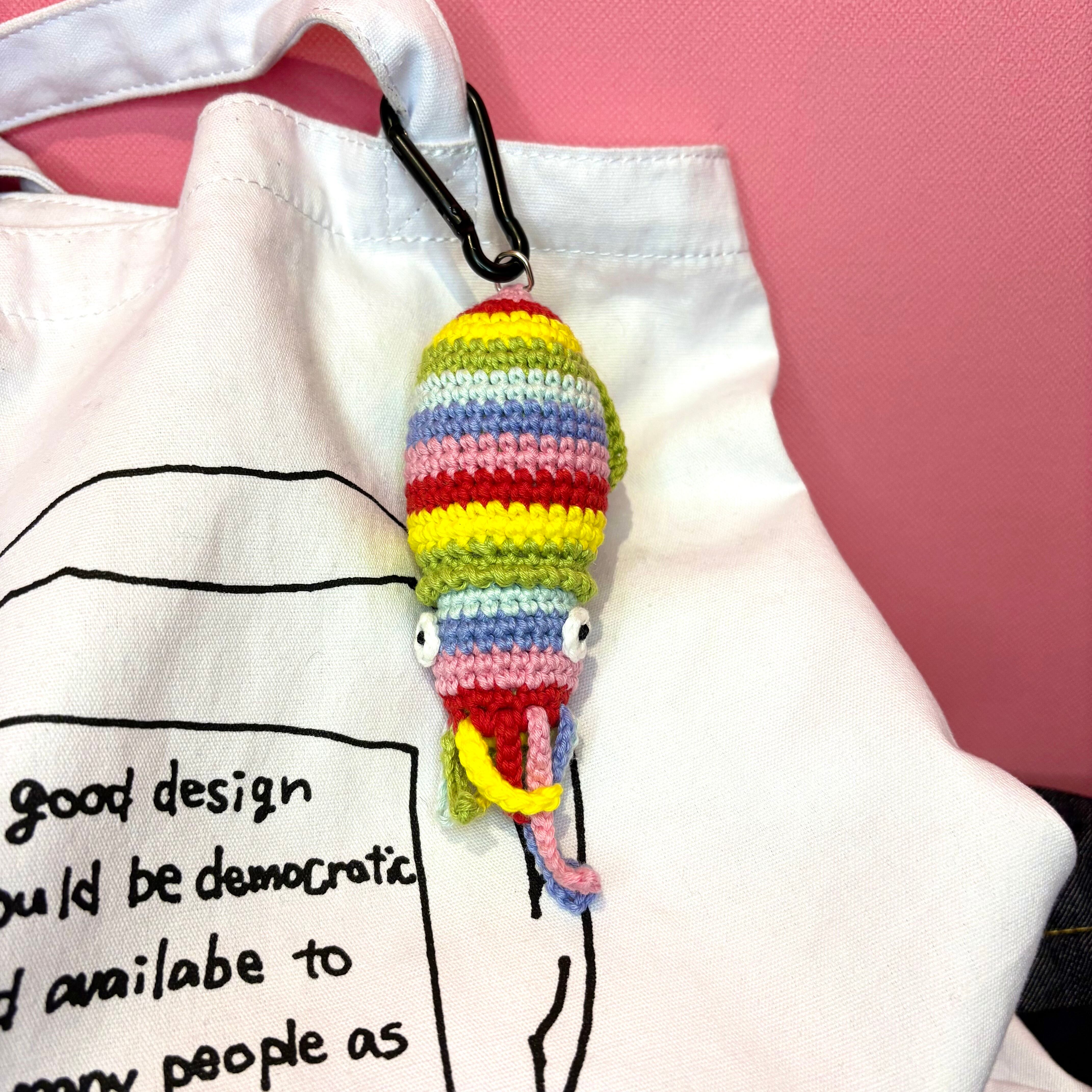 かぎ針編みのイカ型チャームです。ハンドメイドの風合いを楽しんでいただけると嬉しいです。